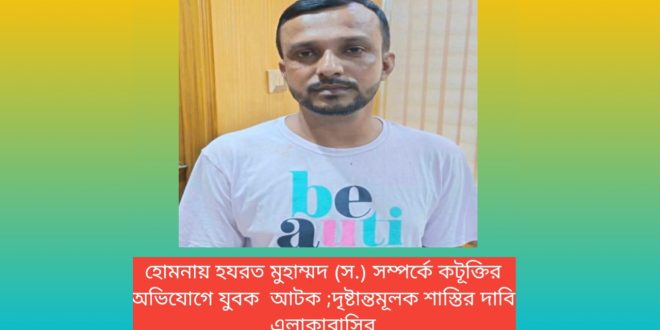 হোমনা( কুমিল্লা) প্রতিনিধিকুমিল্লার হোমনায় সামাজিক যোগাযোগ মাধ্যমে বিশ্বনবী হযরত মুহাম্মদ (সা.) সম্পর্কে কটূক্তির অভিযোগে মহসিন (৩৫) নামে এক যুবককে গ্রেফতার করেছে হোমনা থানা পুলিশ। মহসিন আছাদপুর গ্রামের আলেক শাহর ছেলে। বুধবার (১৭ সেপ্টেম্বর) দুপুরে বাংলাদেশ ইসলামী যুবসেনা হোমনা উপজেলা শাখার সাংগাঠনিক সম্পাদক মো. শরিফুল ইসলাম বাদী হয়ে মহসিনের বিরুদ্ধে হোমনা …